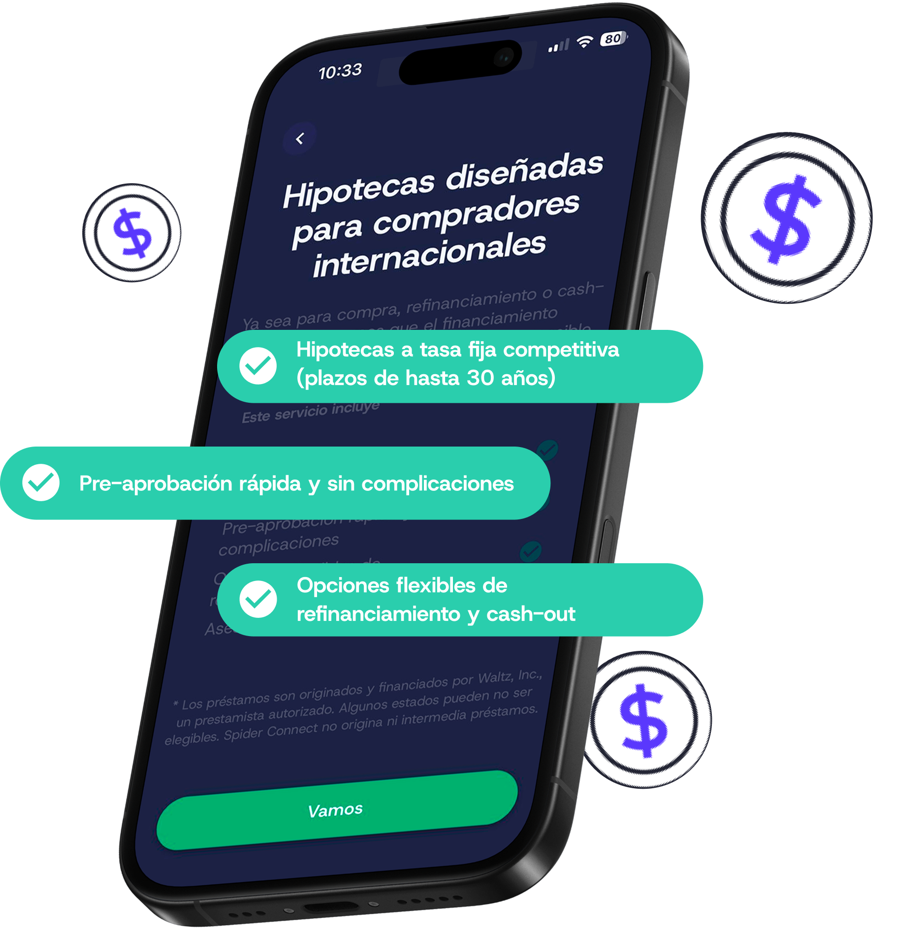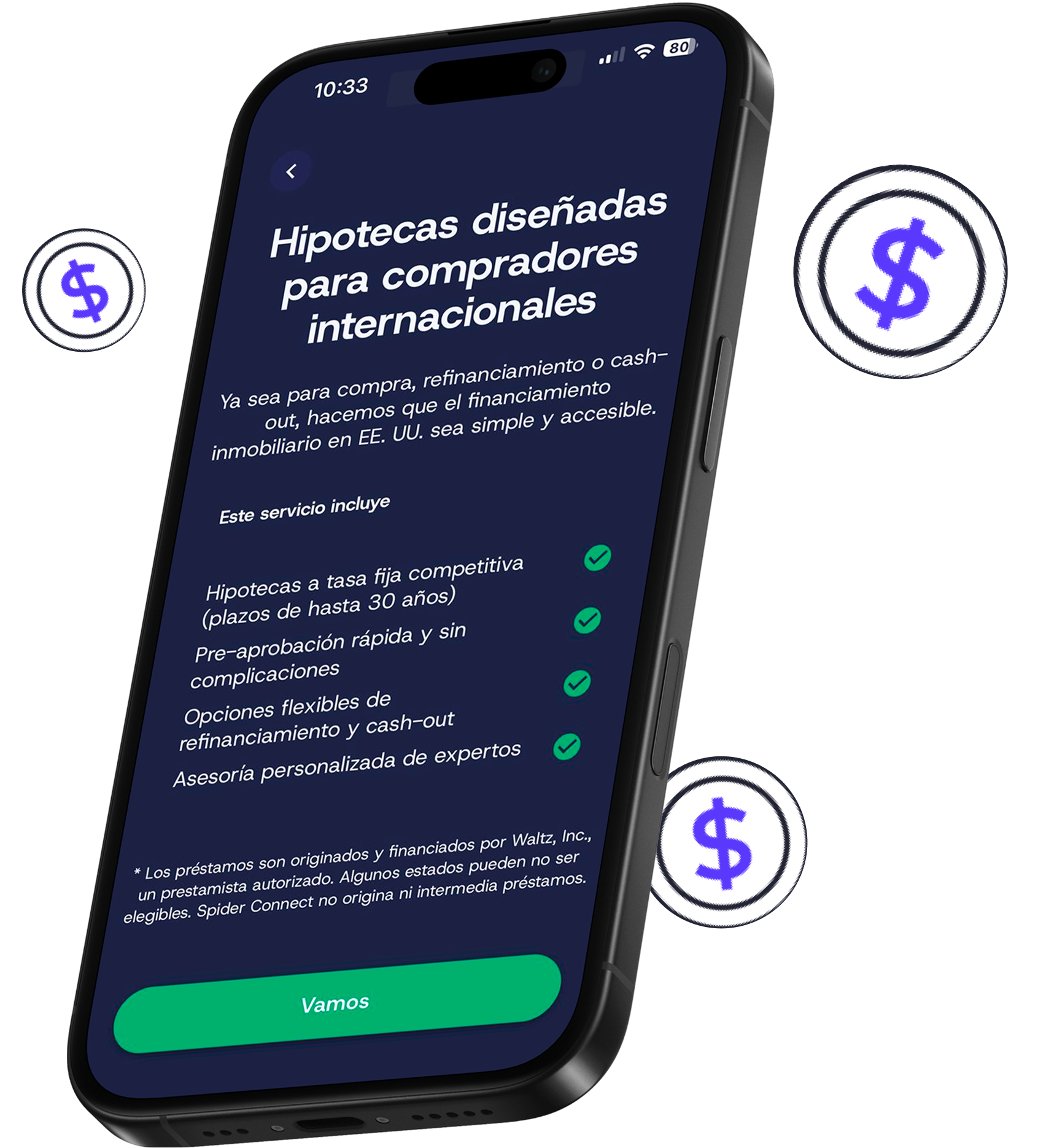 Los préstamos son originados y financiados por Waltz, Inc. y sus entidades afiliadas (Waltz Capital Fund 1 LLC y Waltz Capital Fund 2 LLC) en todos los estados, excepto Arizona, donde los préstamos son originados por Waltz Mortgages LLC (Licencia BK-2001372, NMLS 2620819).Spider Connect no origina ni intermedia préstamos, sino que actúa como plataforma de acceso digital a dichos servicios.Las tasas, condiciones y elegibilidad están sujetas a revisión crediticia, evaluación de la propiedad y aprobación final por parte de Waltz.El producto está destinado exclusivamente a fines comerciales o de inversión inmobiliaria, y debe estar respaldado por propiedades de alquiler no ocupadas por el propietario.Algunos estados pueden no ser elegibles.